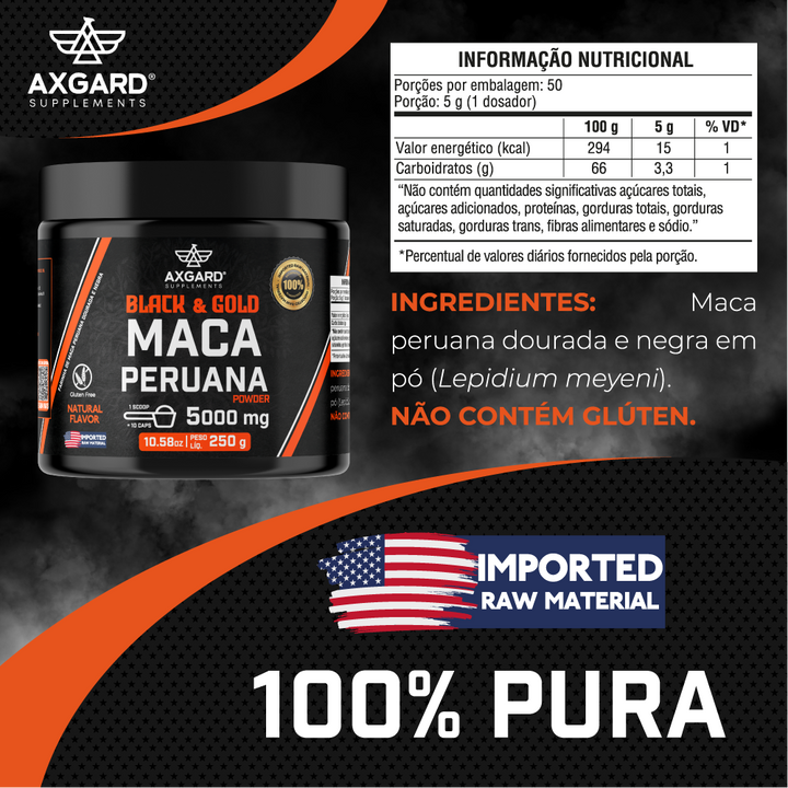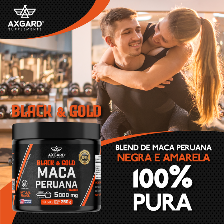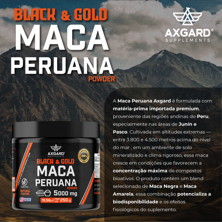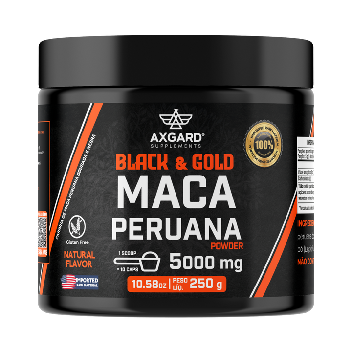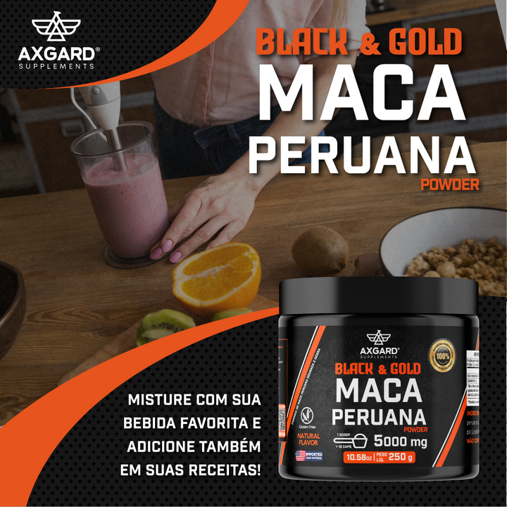 Pote com 250g de Maca Peruana em pó. Combinação negra e dourada, cada porção com 5000mg. Produto natural, nutritivo e versátil para sucos, vitaminas e receitas.