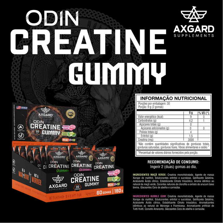 Odin Creatine é a creatina monohidrata da Axgard Supplements, com granulação de 200 mesh, 100% importada e grau de purea testado em laboratório. A creatina monoidratada é a que tem maior número de evidências tanto para a segurança quanto para a eficácia, além de ser a melhor forma que eleva as concentrações musculares de creatina.
